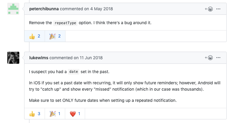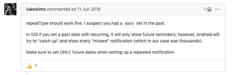 그래서 아래 링크를 보고 repeatType을 주석 처리 해봤더니 알림이 한 번만 왔다.