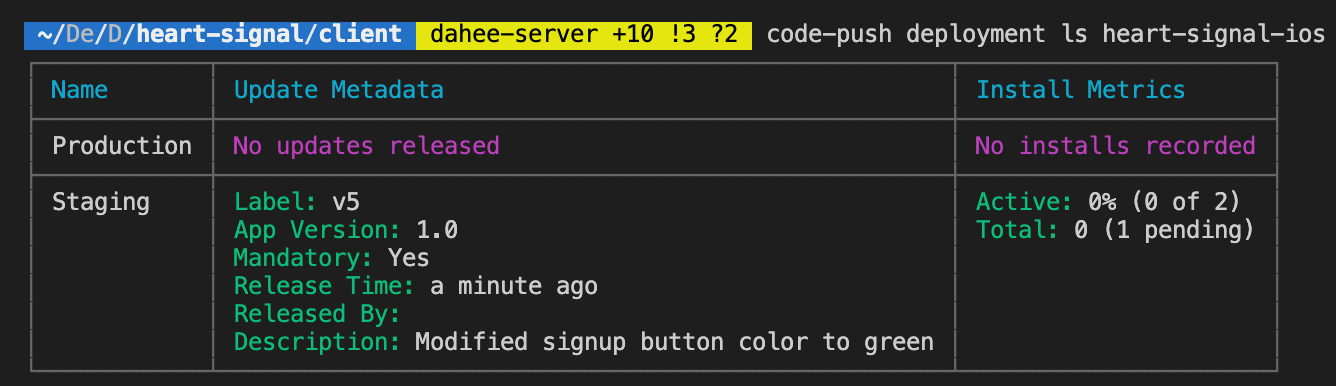 code-push release-react heart-signal-ios ios -m --description "Modified signup button color to green"