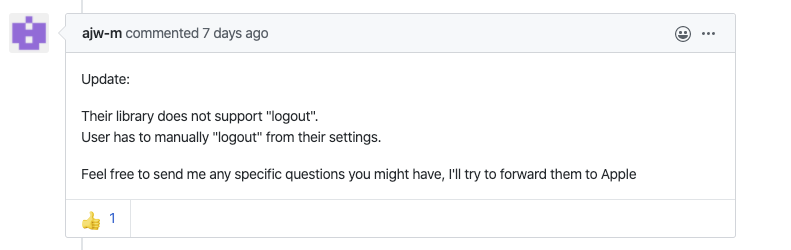 개발자가 자체적으로 로그아웃을 만들어야 함. 애플에 문의 보냈지만 적절한 답변을 얻지 못한 모양이다.
