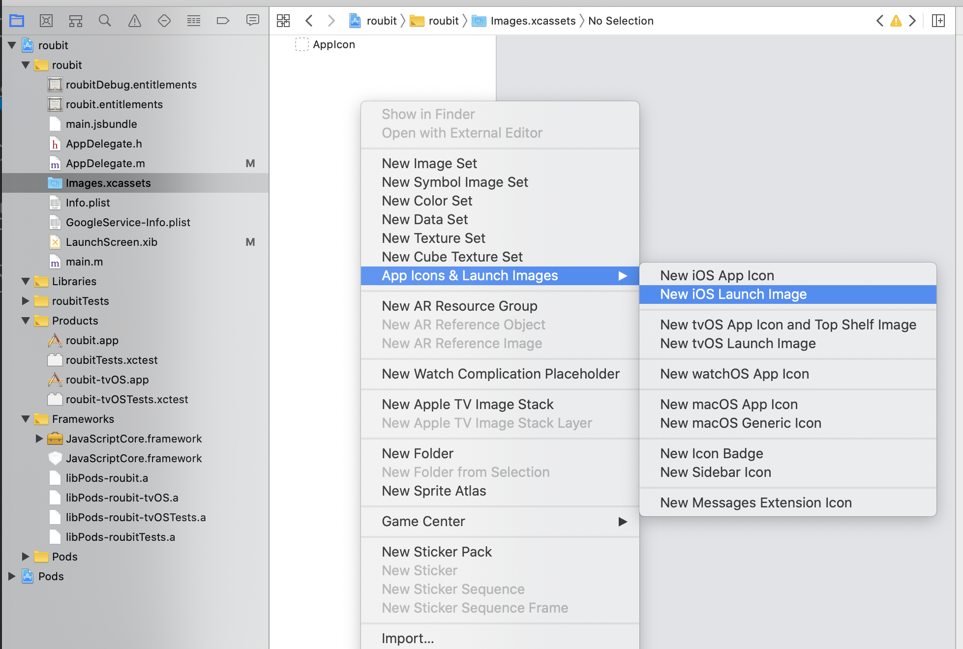 ios/appname/Images.scassets - AppIcon 있는 빈 바탕 우클릭 - App Icons & Launch Images - New iOS Lanch Image