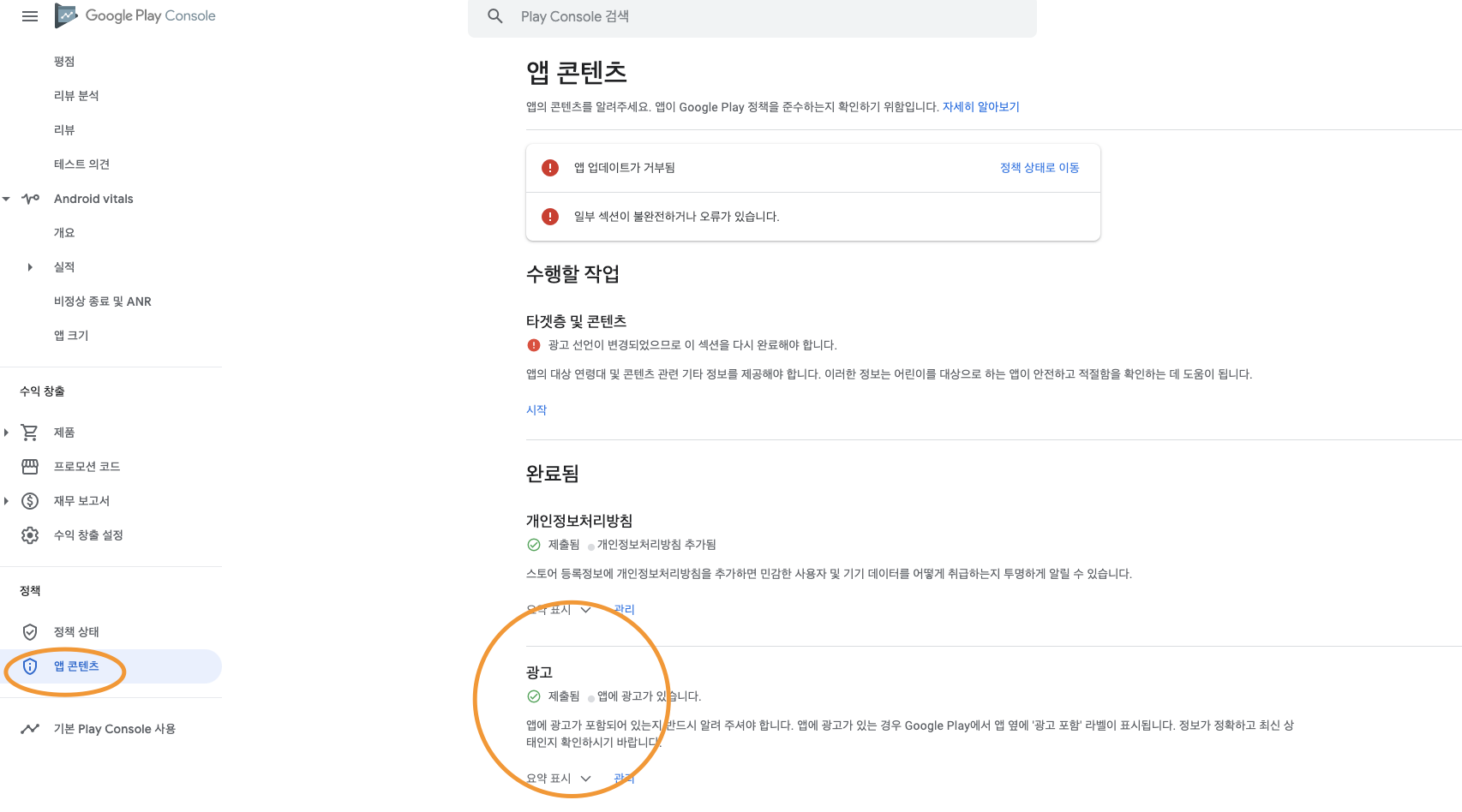 1) 정책 - 앱 콘텐츠 - 광고 - 관리를 클릭해 광고가 있다고 표시한다.