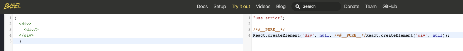 바벨은 왼쪽 코드를 오른쪽처럼 자바스크립트 문법으로 변경시켜준다.