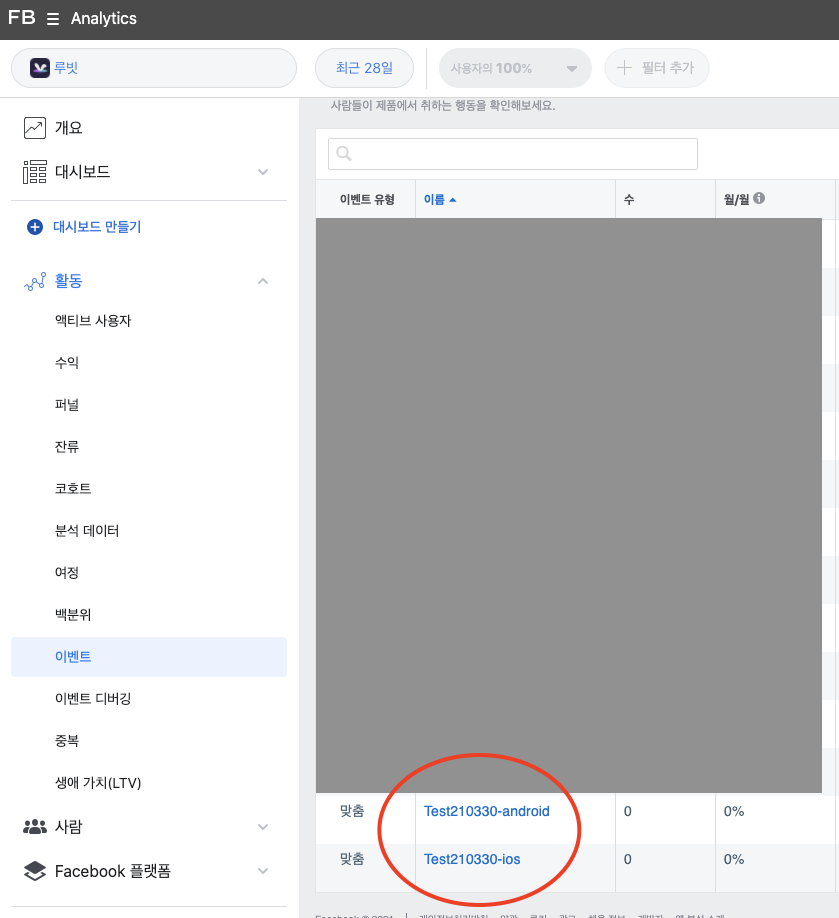 - 위처럼 코드를 작성하면 아래 사진처럼 활동 > 이벤트에 기록이 됩니다! 이렇게 기록이 잘되면 연결이 된 것입니다.
