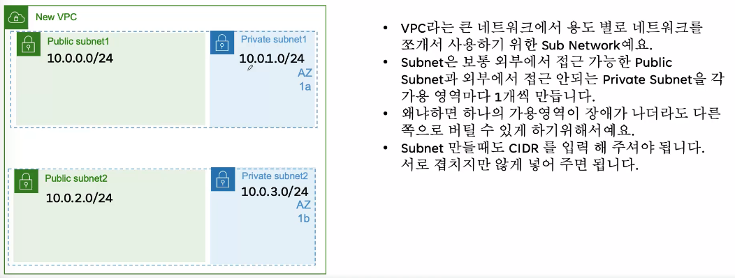 - VPC에서 쪼개진 영역을 subnet이라 하고, public과 private있다.