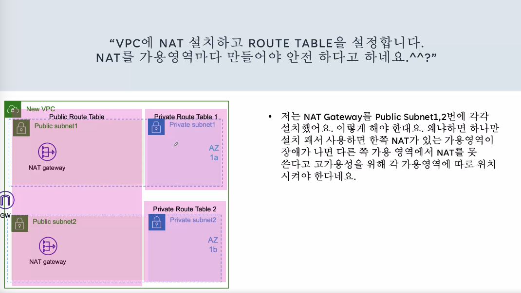 NAT Gateway를 Public Subnet 1번,2번에 만들자. 다른 가용영역에 고장나도 다른 곳에서 사용 가능하게.