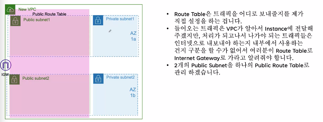마지막으로, Route Table을 만들어서, Public Subnet들이 Internet Gateway를 통해 인터넷이 되도록 설정까지 해줘야 해.