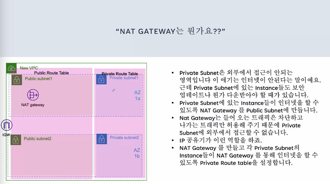 이제 Private Subnet에서도 인터넷이 가능하도록 NAT Gateway를 만들거야~
