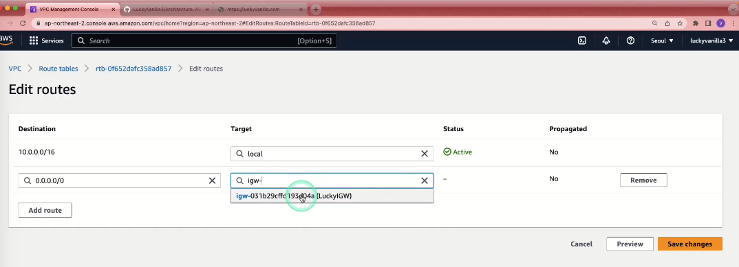 - 근데 라우팅 테이블은 적용 우선순위가 있어. Longest Prefix Match: Prefix 숫자가 클수록 네트워크 범위가 작기 때문에, 작은 것부터 적용됨. 그래서 내부에서 돌아야하는 것 빼고는 전부 IG로 간다~