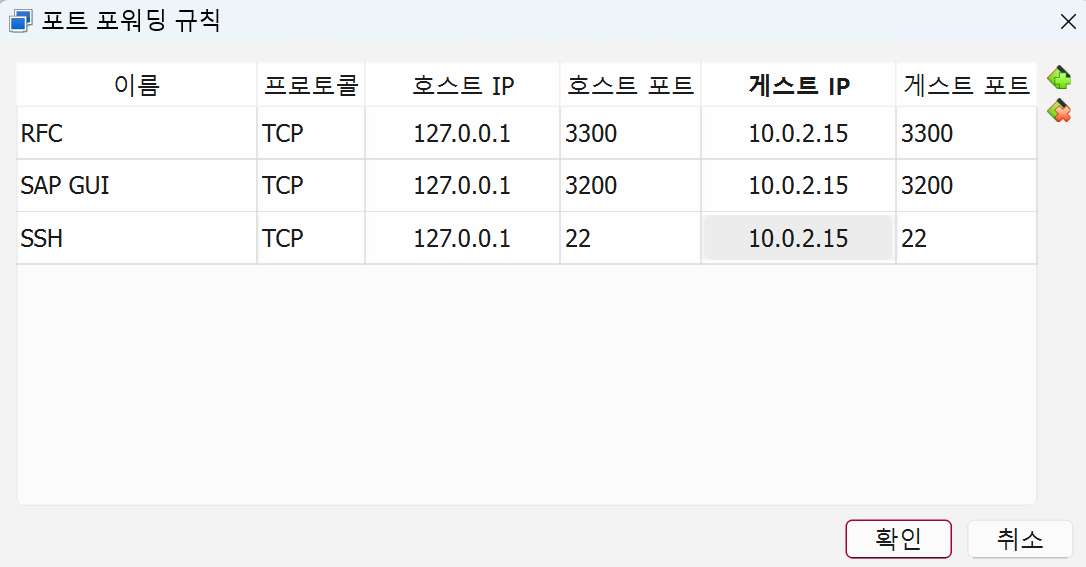 VirtualBox의 설정 > 네트워크 탭 > 포트 포워딩 버튼 클릭